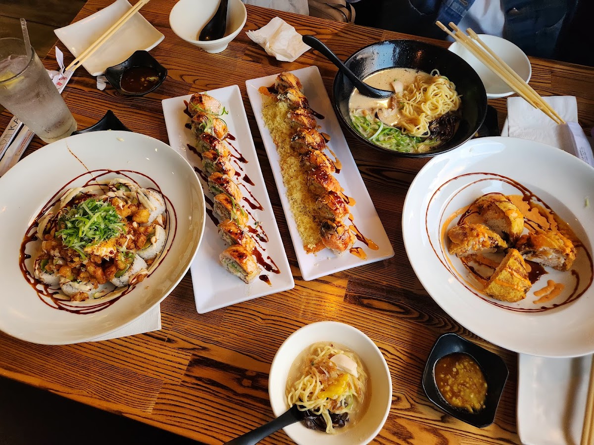 Dishes like their Tonkotsu Ramen and Spicy Miso Ramen showcase well-executed broths that anchor the menu. The sushi here stands out for its generous portion sizes and fresh fish, with popular choices including the Rainbow Roll and Spicy Tuna on Crispy Rice. For those who enjoy sharing, options like Gyoza, Brussel Sprouts, and Green Onion Sesame Chicken add a nice mix of textures and flavors. The menu leans comfortably toward classic preparations but with enough variety to satisfy different cravings — from sashimi combos to heartier grilled items like Beef Teriyaki and Tempura.